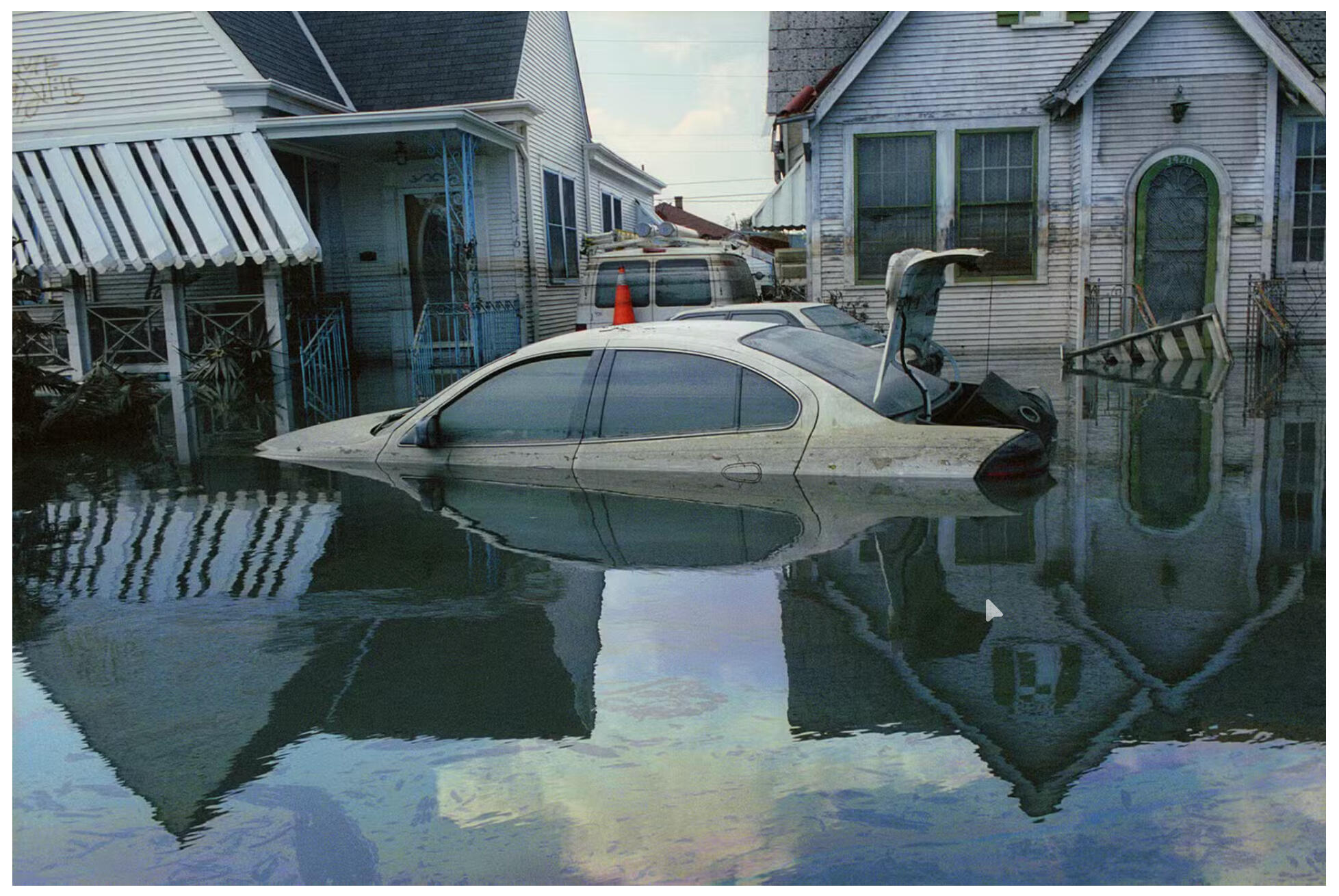 The awning looks like piano keys, and the cross form in the middle bows to religion. Music and religion—so basic to Black life. Lines on the houses show how high the water had been.